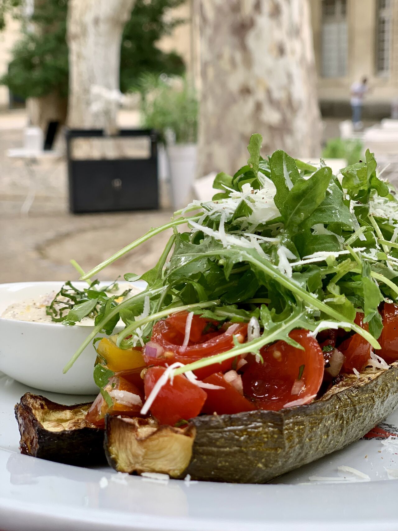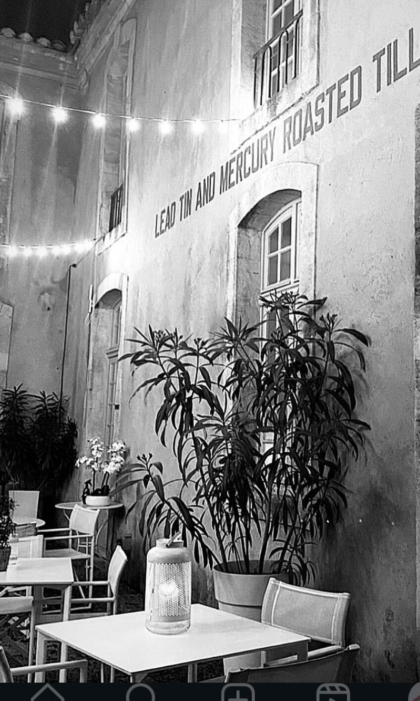 La terrasse du restaurant se déploie dans la cour intérieure à l'ombre des platanes centenaires et en retrait du tumulte de la ville.