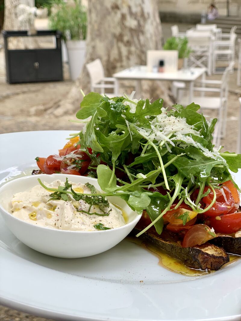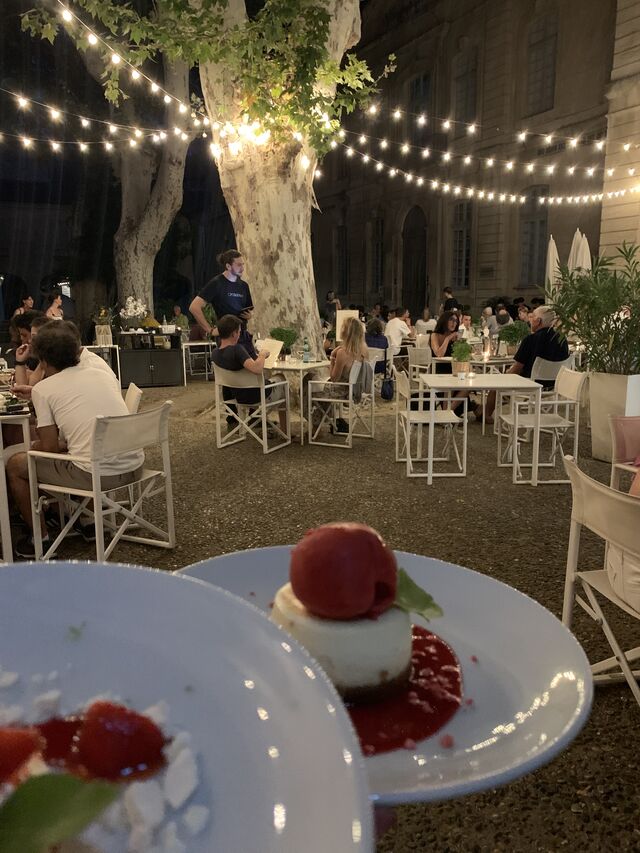 La terrasse du restaurant se déploie dans la cour intérieure à l'ombre des platanes centenaires et en retrait du tumulte de la ville.